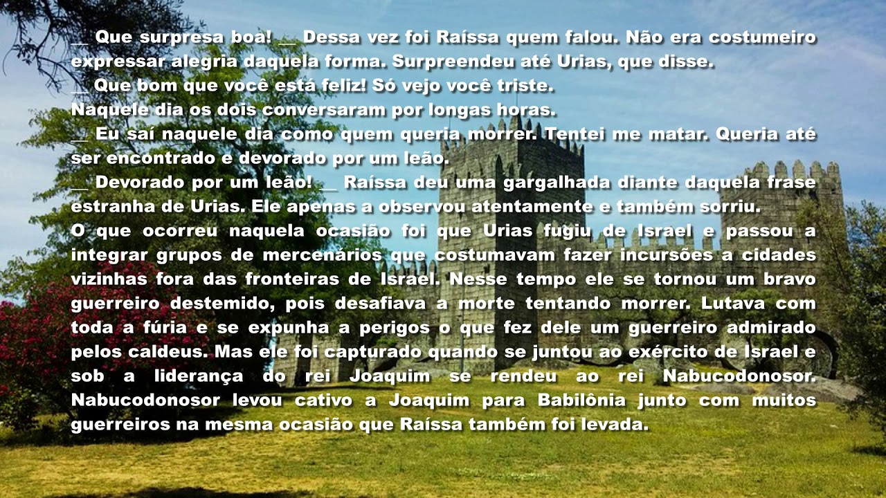 Outros acontecimentos nos dias atuais fecham o ciclo que culminará em momentos melhores para a humanidade. Embora tenha como pano de fundo fatos reais narrados na Bíblia e até cite personagens reais como o profeta Daniel, todos os acontecimentos e personagens são fictícios. São apenas baseados em fatos reais narrados na Bíblia. Veja a seguir a sinopse do livro.