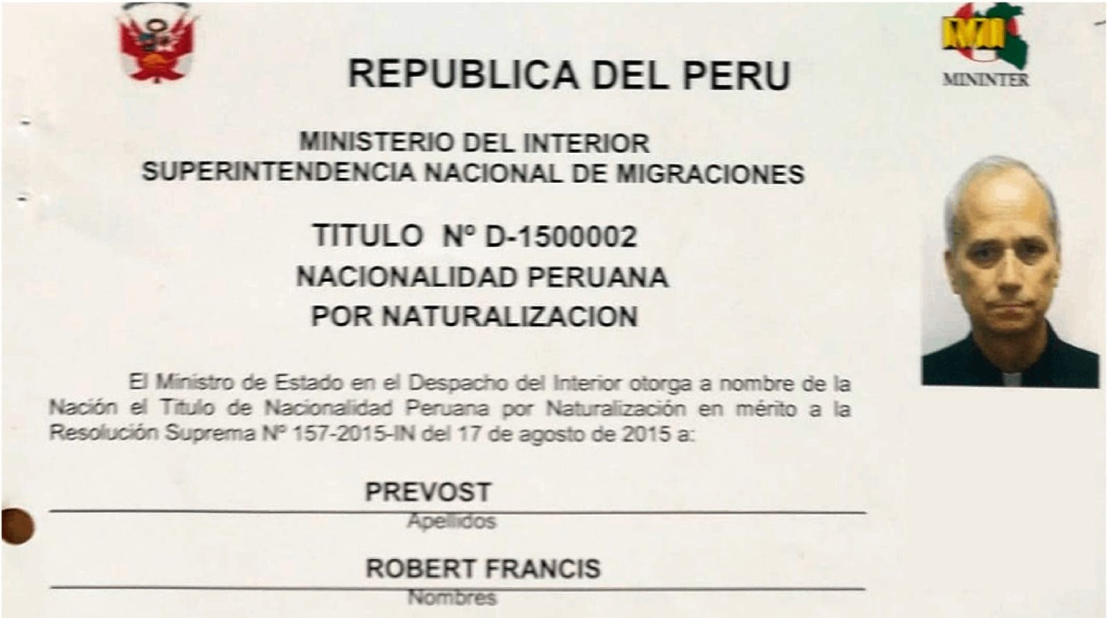 Após a eleição do papa Leão XIV, nesta quinta-feira (8), o governo de Dina Boluarte divulgou a certidão que oficializou a naturalização do religioso como peruano, em 2015.