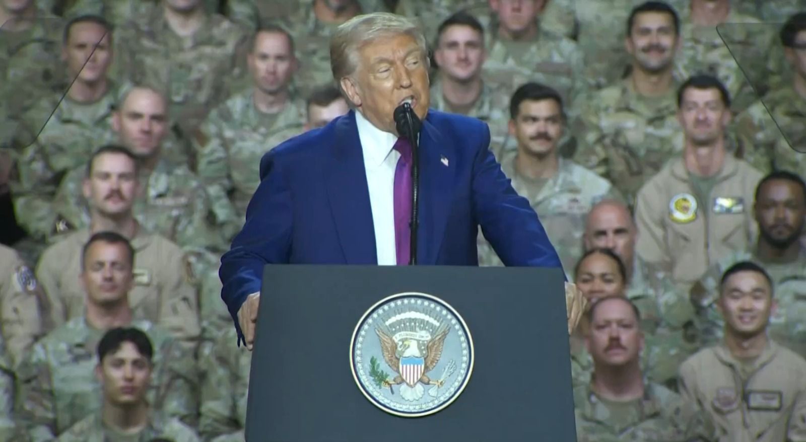 O presidente dos Estados Unidos, Donald Trump, discursa nesta quinta-feira (15) na maior instalação militar dos EUA no Oriente Médio, a Base Aérea de Al Udeid, no Catar.