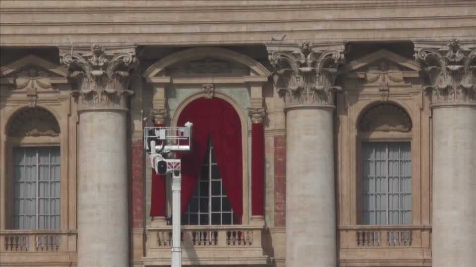 Trabalhadores instalaram cortinas vermelhas na sacada da “Loggia Delle Benedizioni” na Basílica de São Pedro nesta segunda-feira (5), em preparação para o conclave, que deve começar quarta-feira (7).