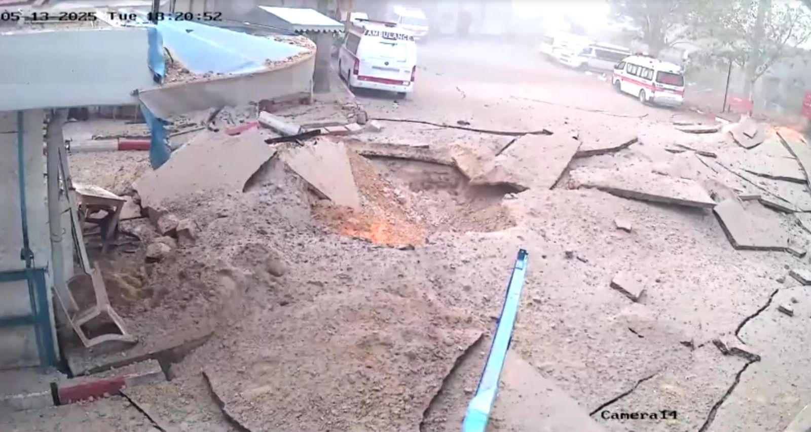 Imagens de uma câmera vigilância mostraram o momento em que um ataque aéreo israelense atingiu pessoas do lado de fora do Hospital Europeu na cidade de Khan Younis, sul de Gaza, na terça-feira (13).